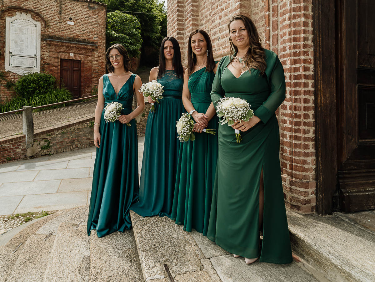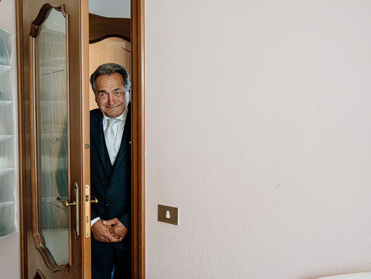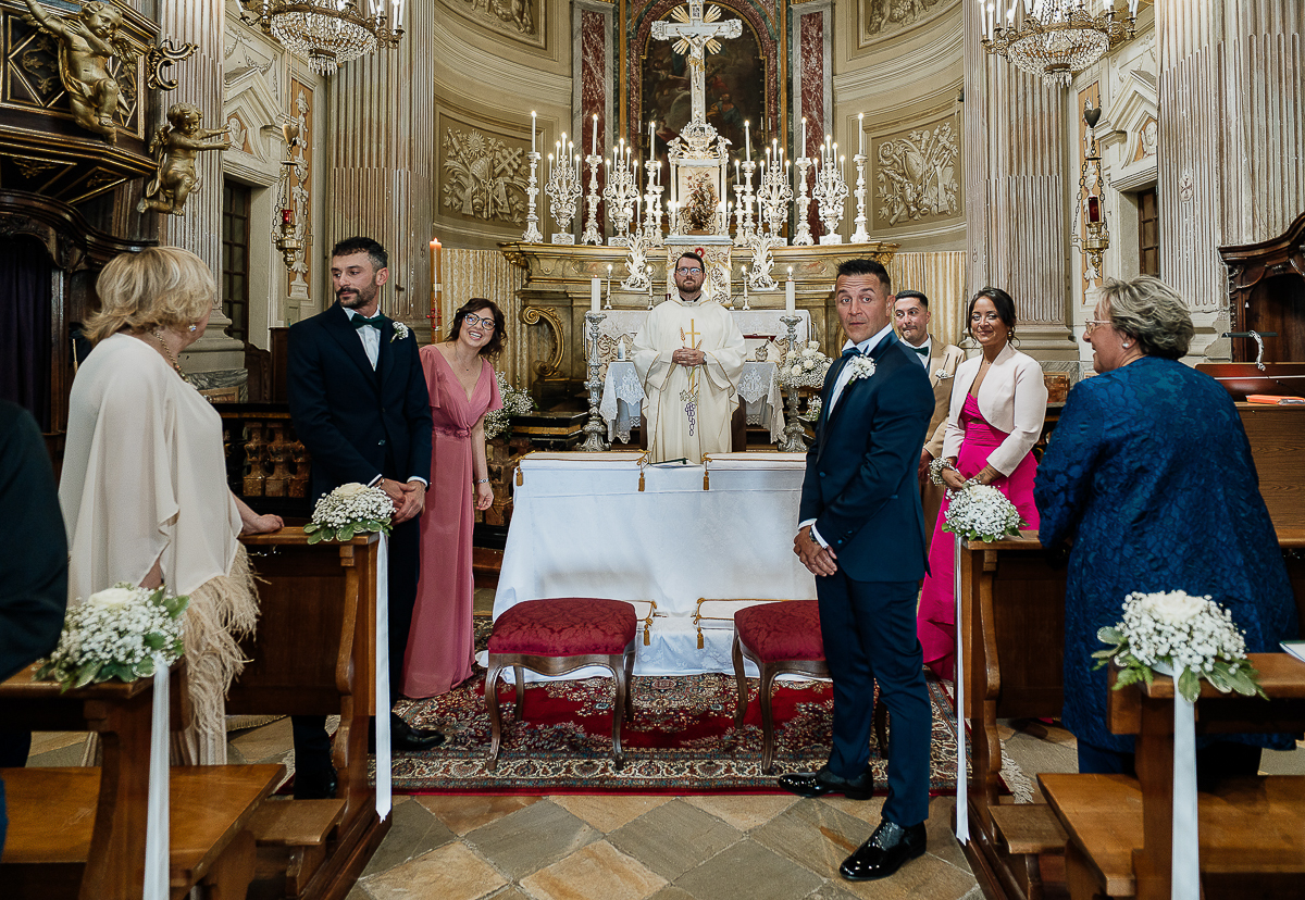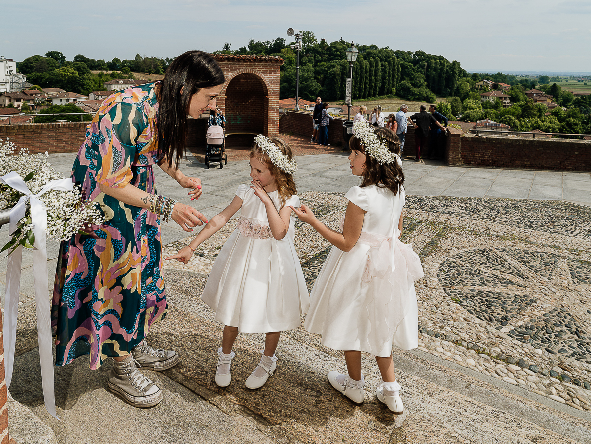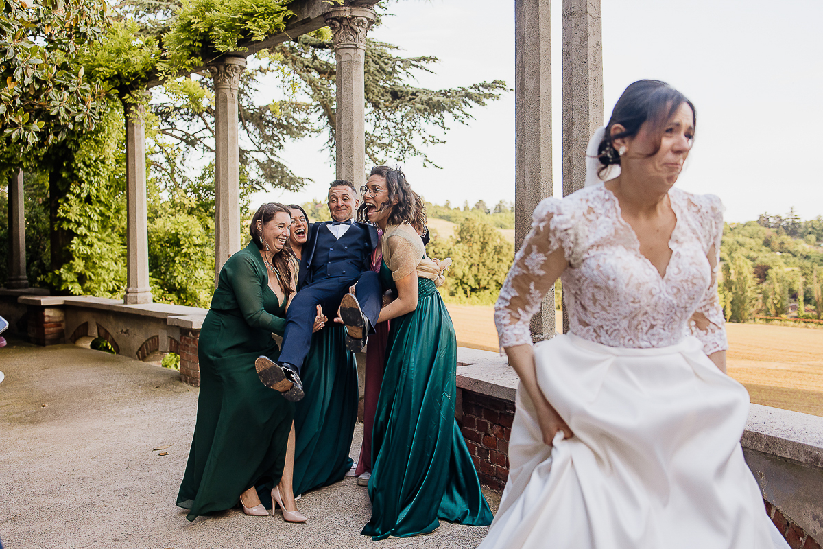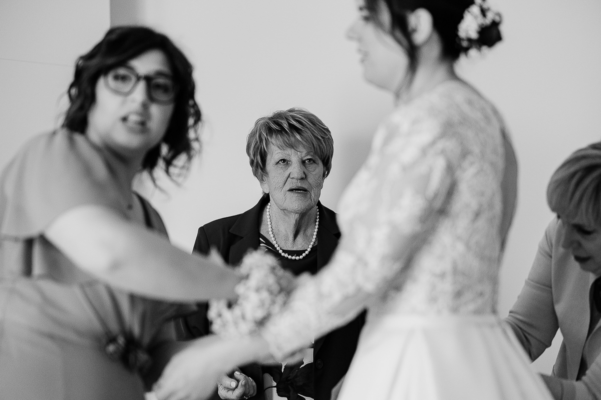 The atmosphere during the preparations was intense and deeply emotional: the bride’s father visibly moved, cheerful bridesmaids, emotional grandparents, and children running through the house with spontaneity and joy. Meanwhile, Gabriele was getting ready in Andezeno, documented by my second photographer, surrounded by his family.