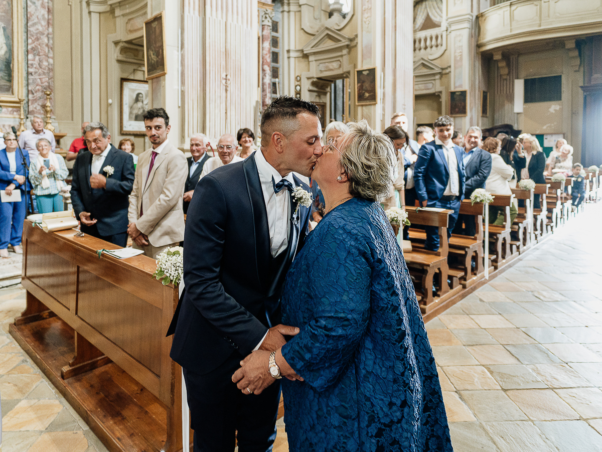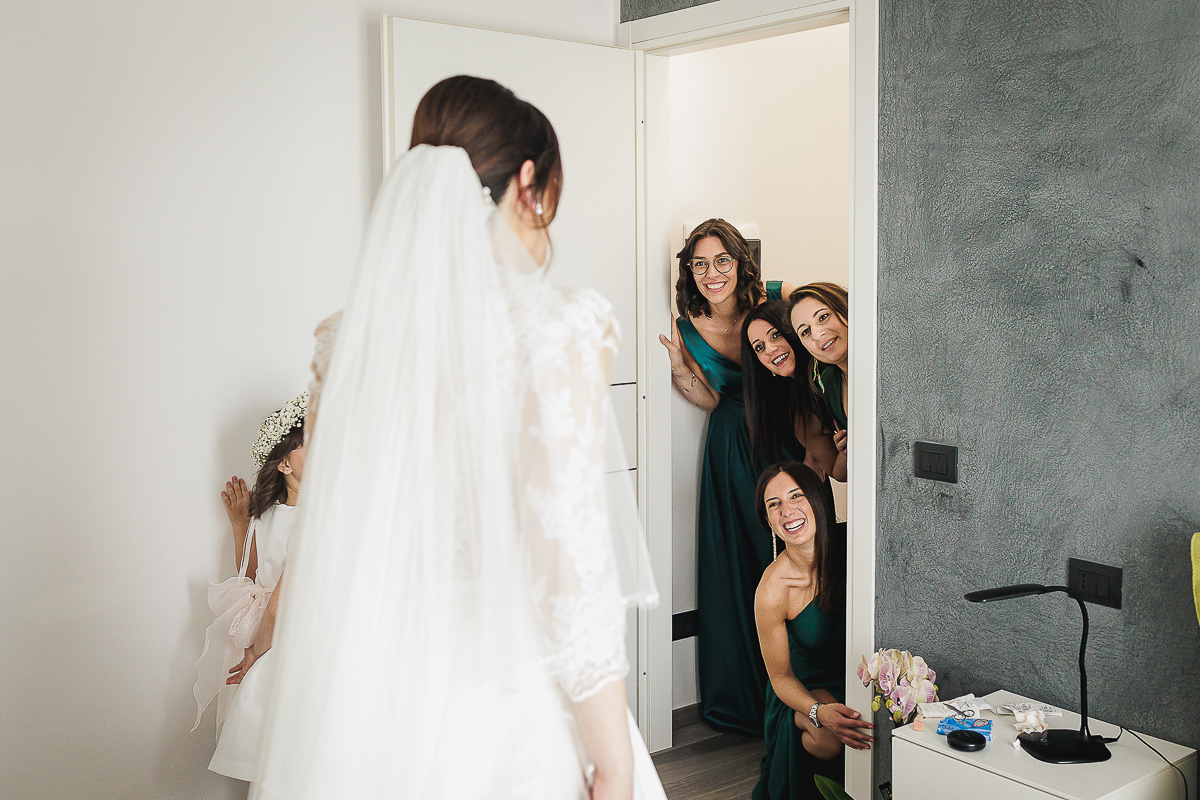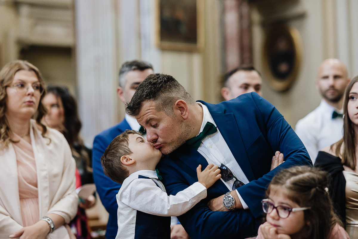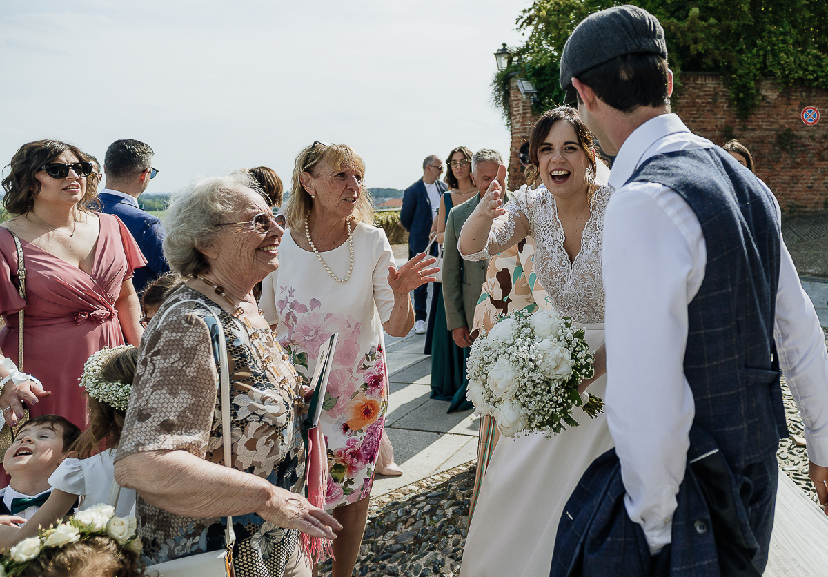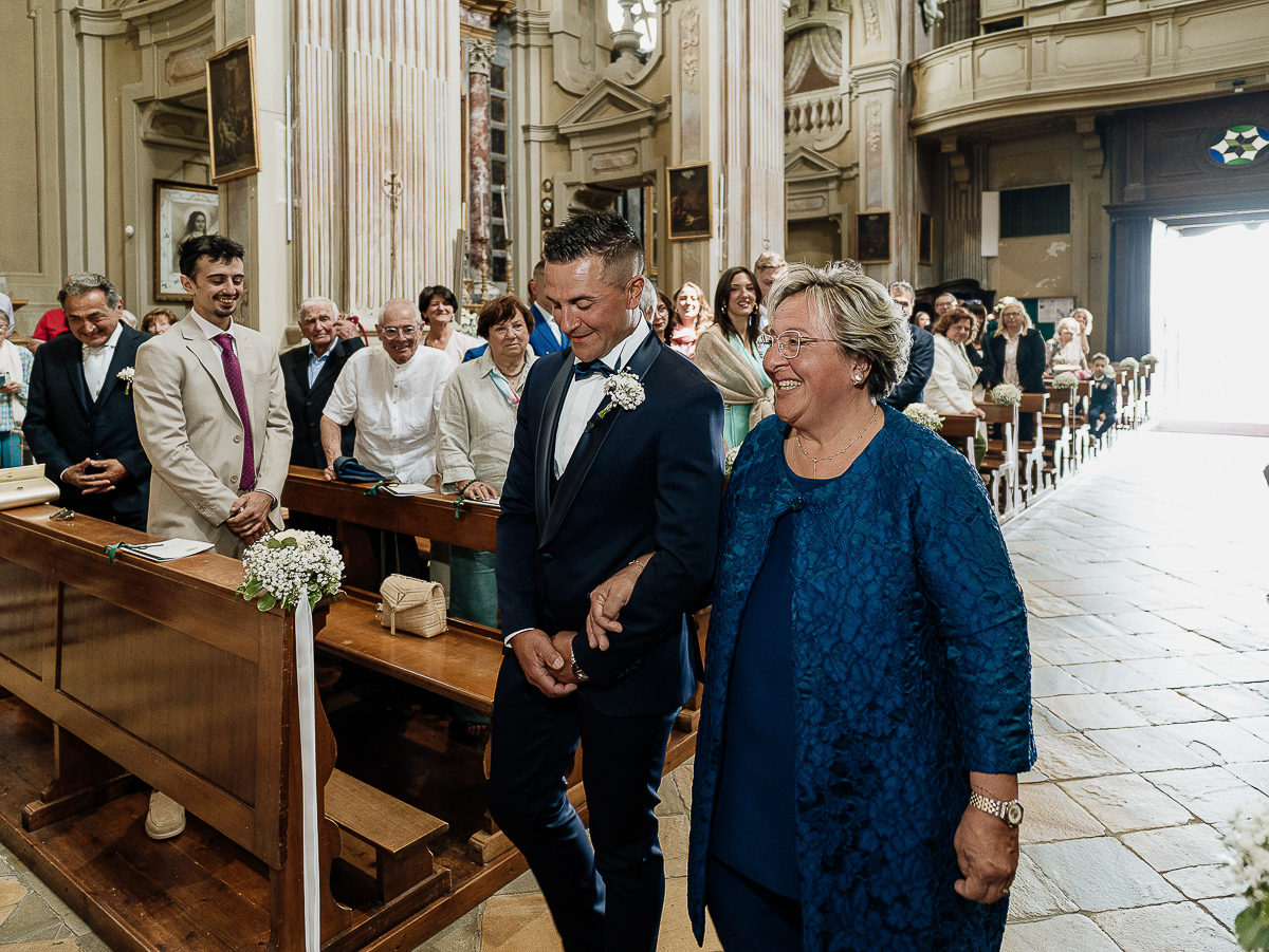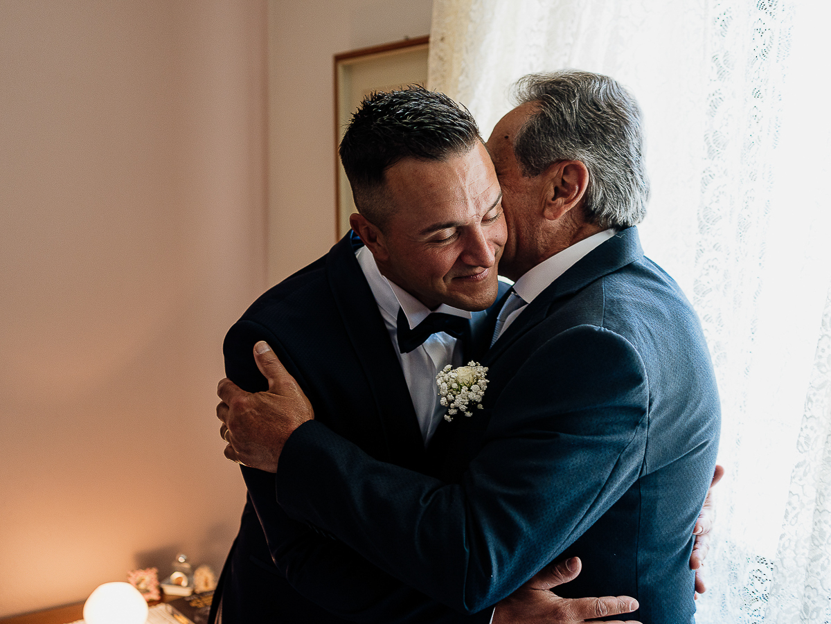 The atmosphere during the preparations was intense and deeply emotional: the bride’s father visibly moved, cheerful bridesmaids, emotional grandparents, and children running through the house with spontaneity and joy. Meanwhile, Gabriele was getting ready in Andezeno, documented by my second photographer, surrounded by his family.
