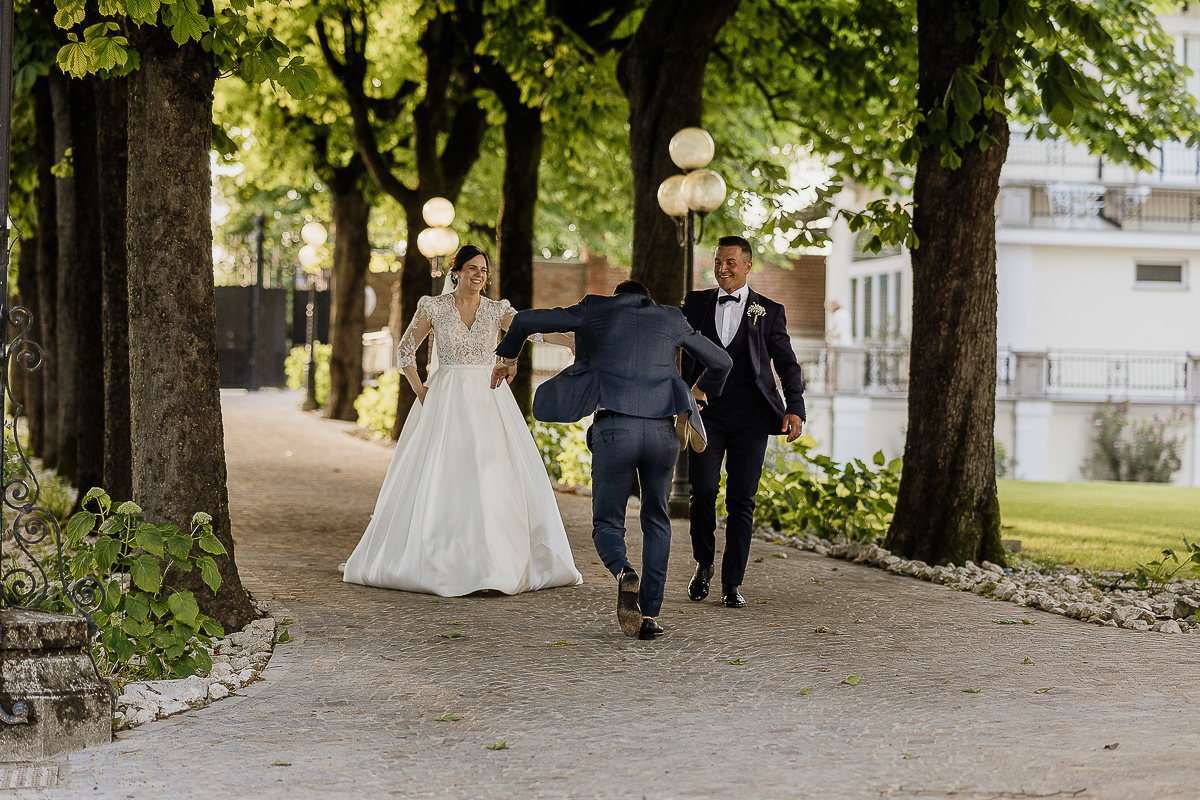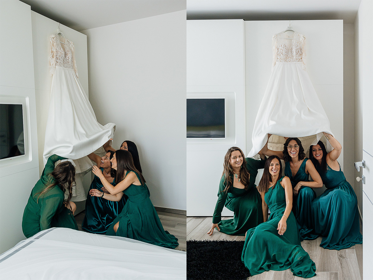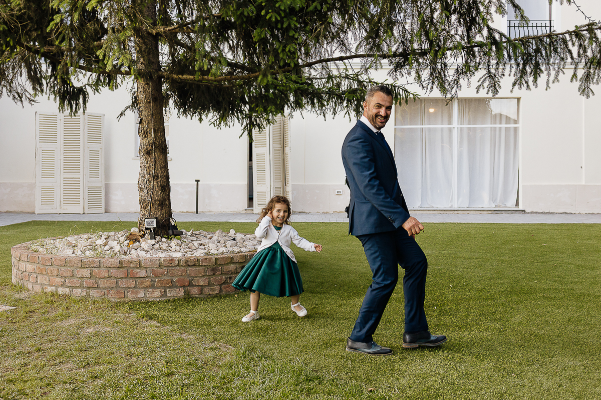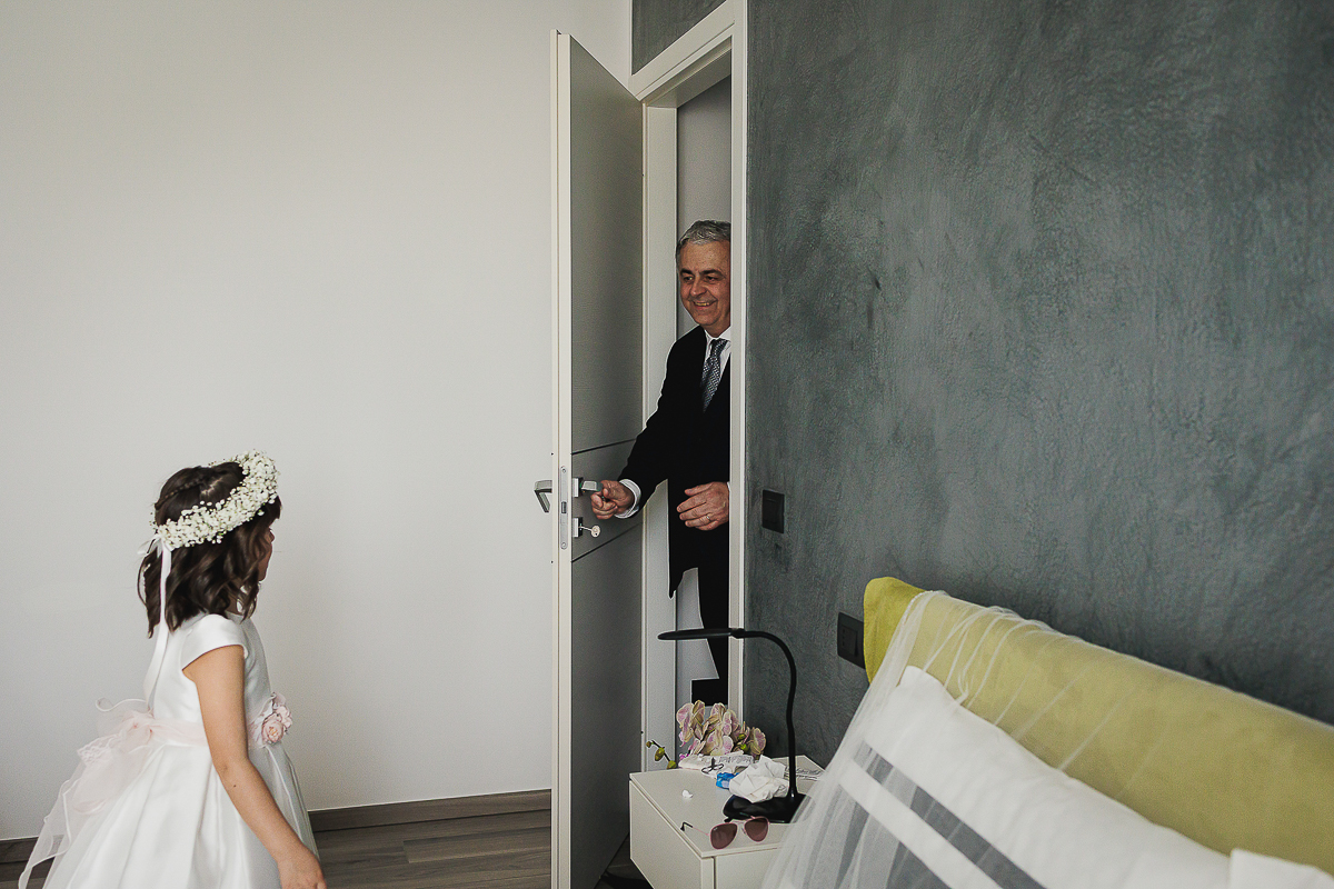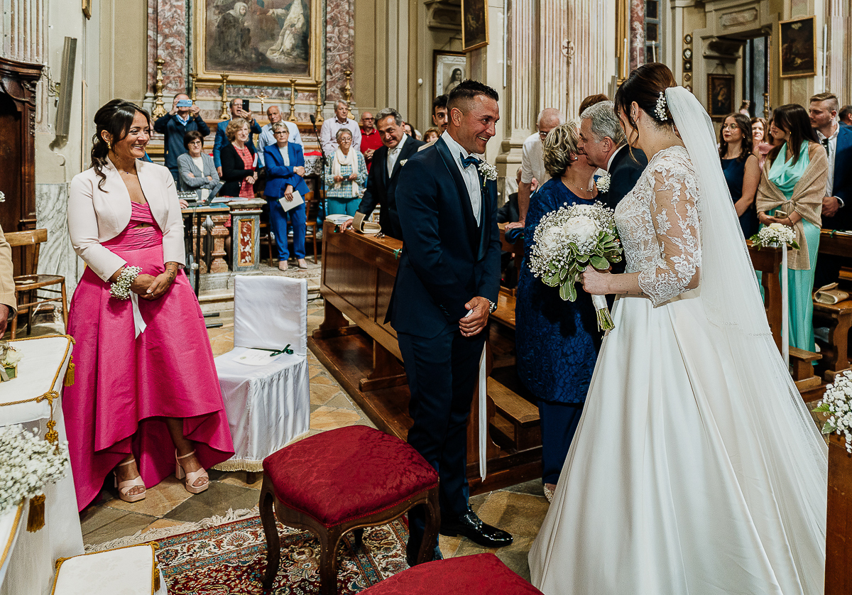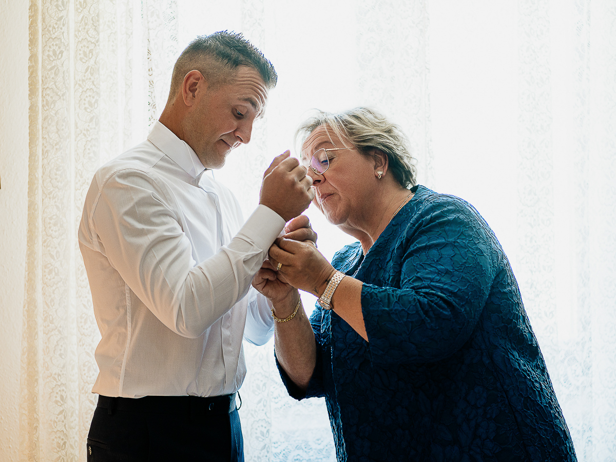 The atmosphere during the preparations was intense and deeply emotional: the bride’s father visibly moved, cheerful bridesmaids, emotional grandparents, and children running through the house with spontaneity and joy. Meanwhile, Gabriele was getting ready in Andezeno, documented by my second photographer, surrounded by his family.