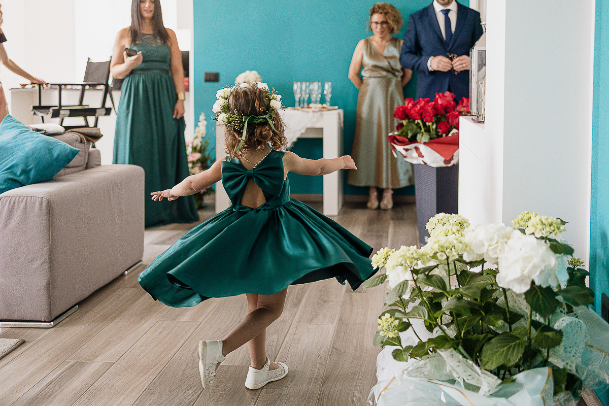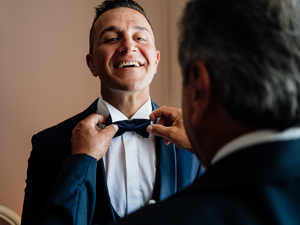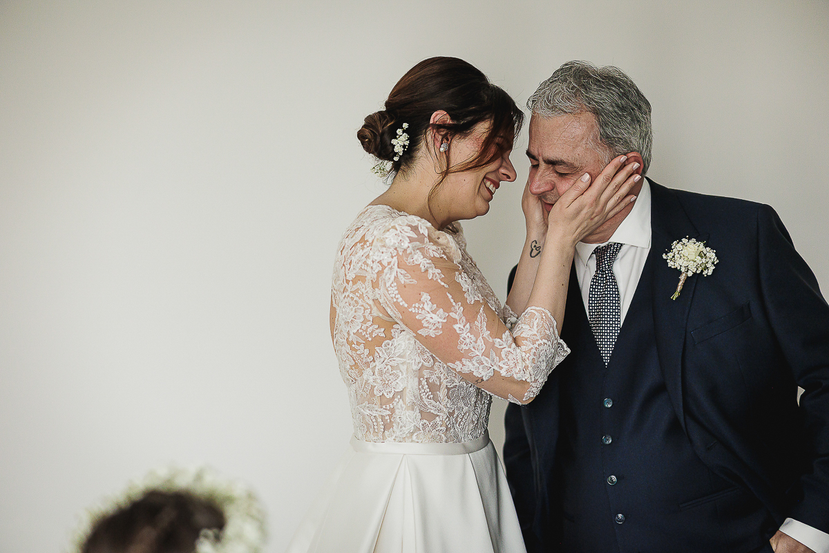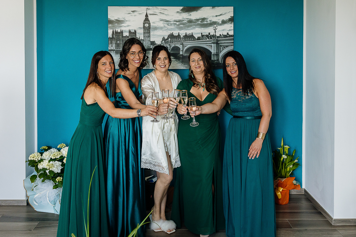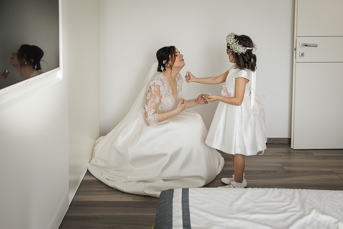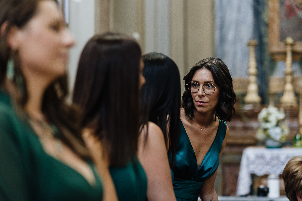 The atmosphere during the preparations was intense and deeply emotional: the bride’s father visibly moved, cheerful bridesmaids, emotional grandparents, and children running through the house with spontaneity and joy. Meanwhile, Gabriele was getting ready in Andezeno, documented by my second photographer, surrounded by his family.