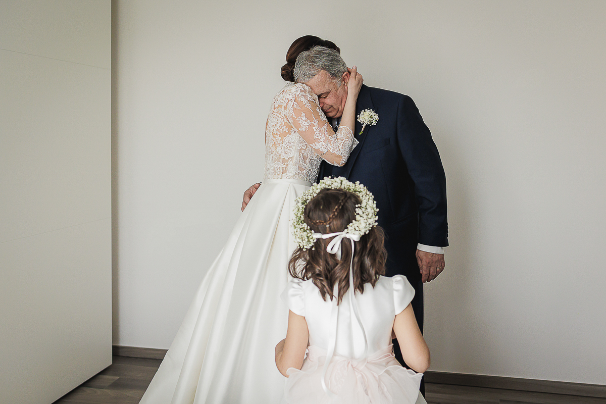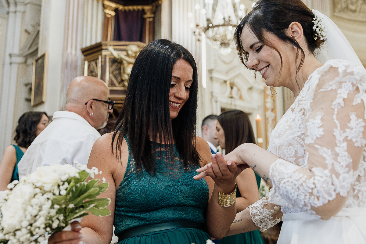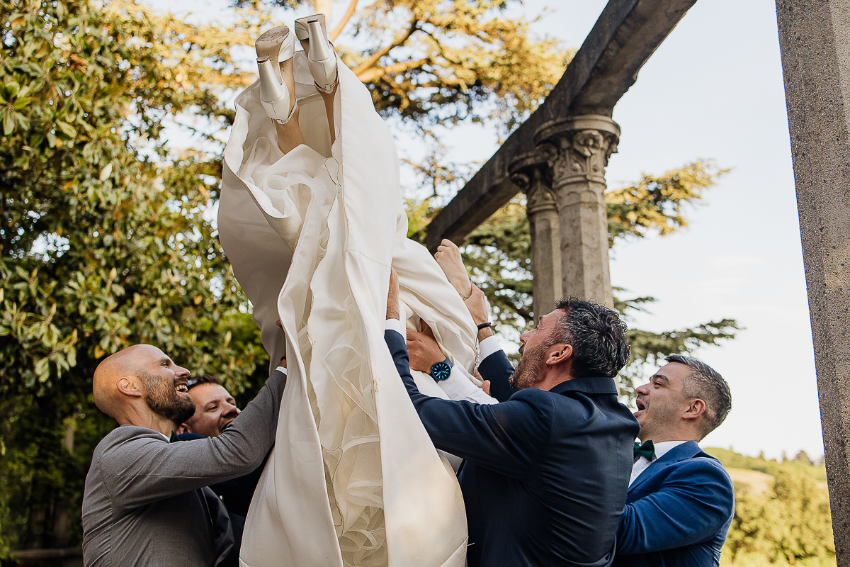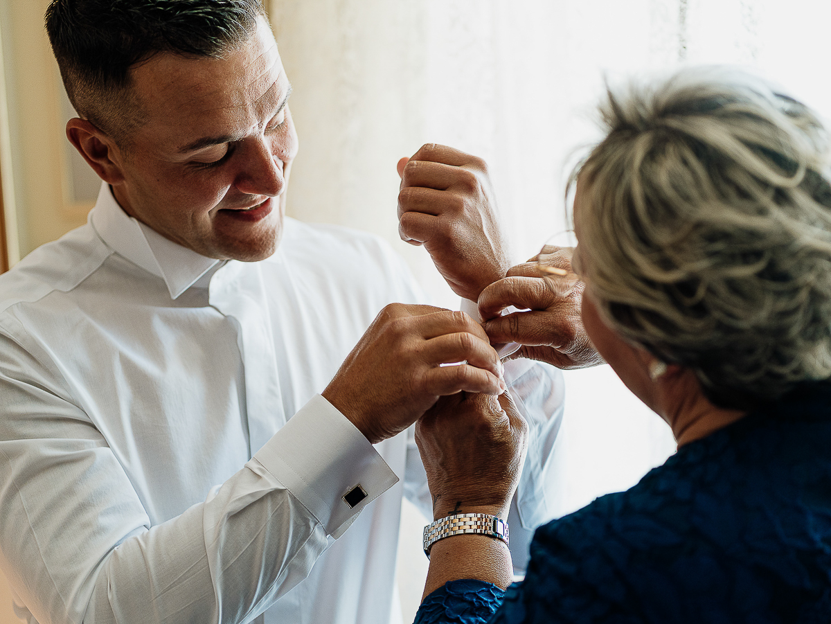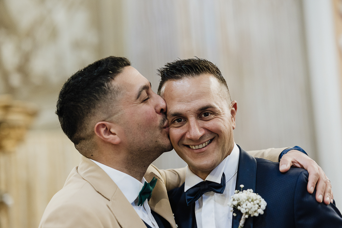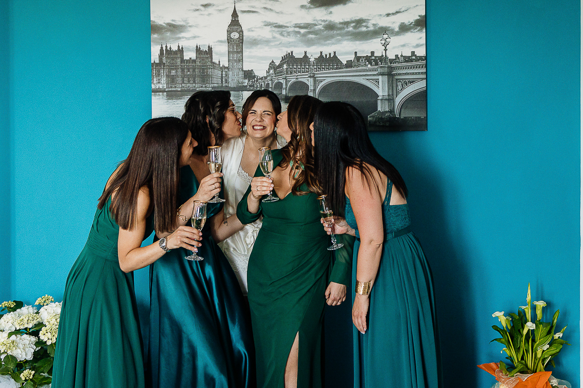 The atmosphere during the preparations was intense and deeply emotional: the bride’s father visibly moved, cheerful bridesmaids, emotional grandparents, and children running through the house with spontaneity and joy. Meanwhile, Gabriele was getting ready in Andezeno, documented by my second photographer, surrounded by his family.