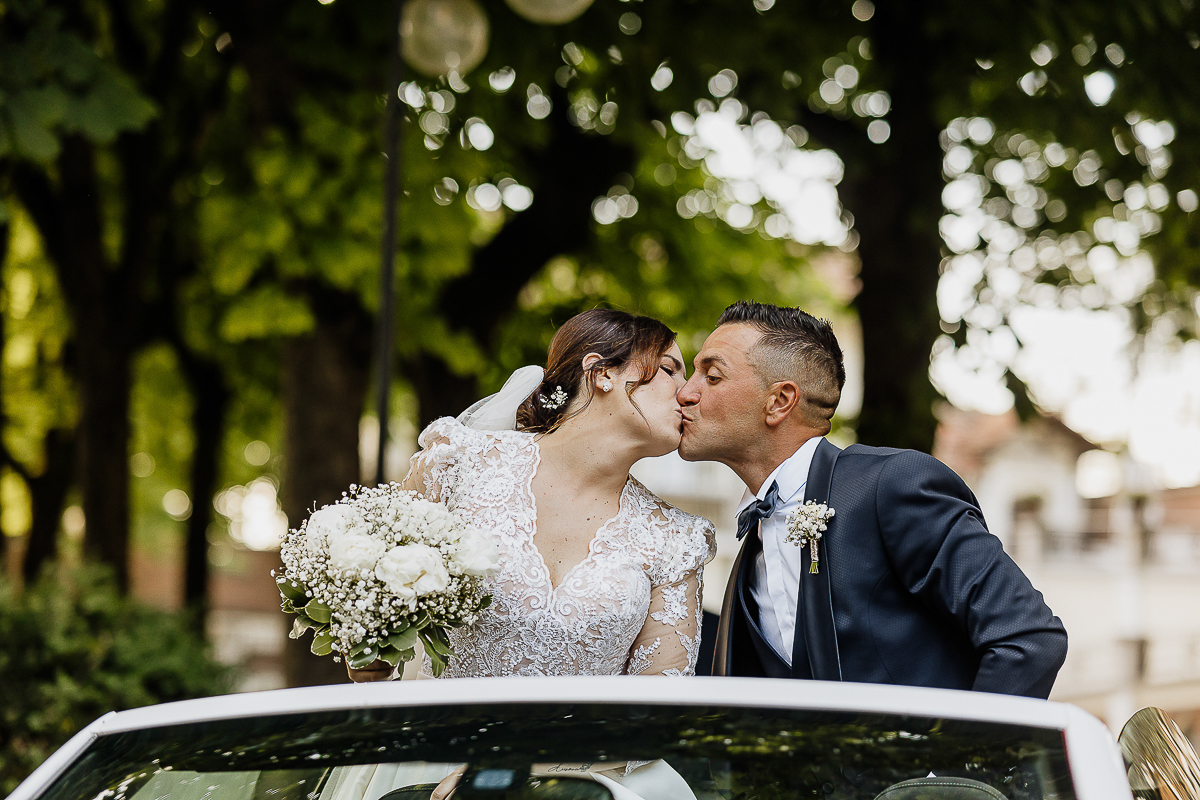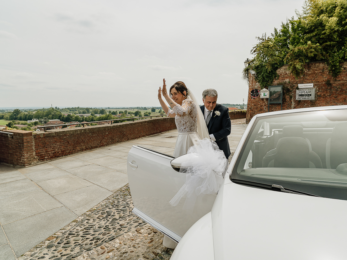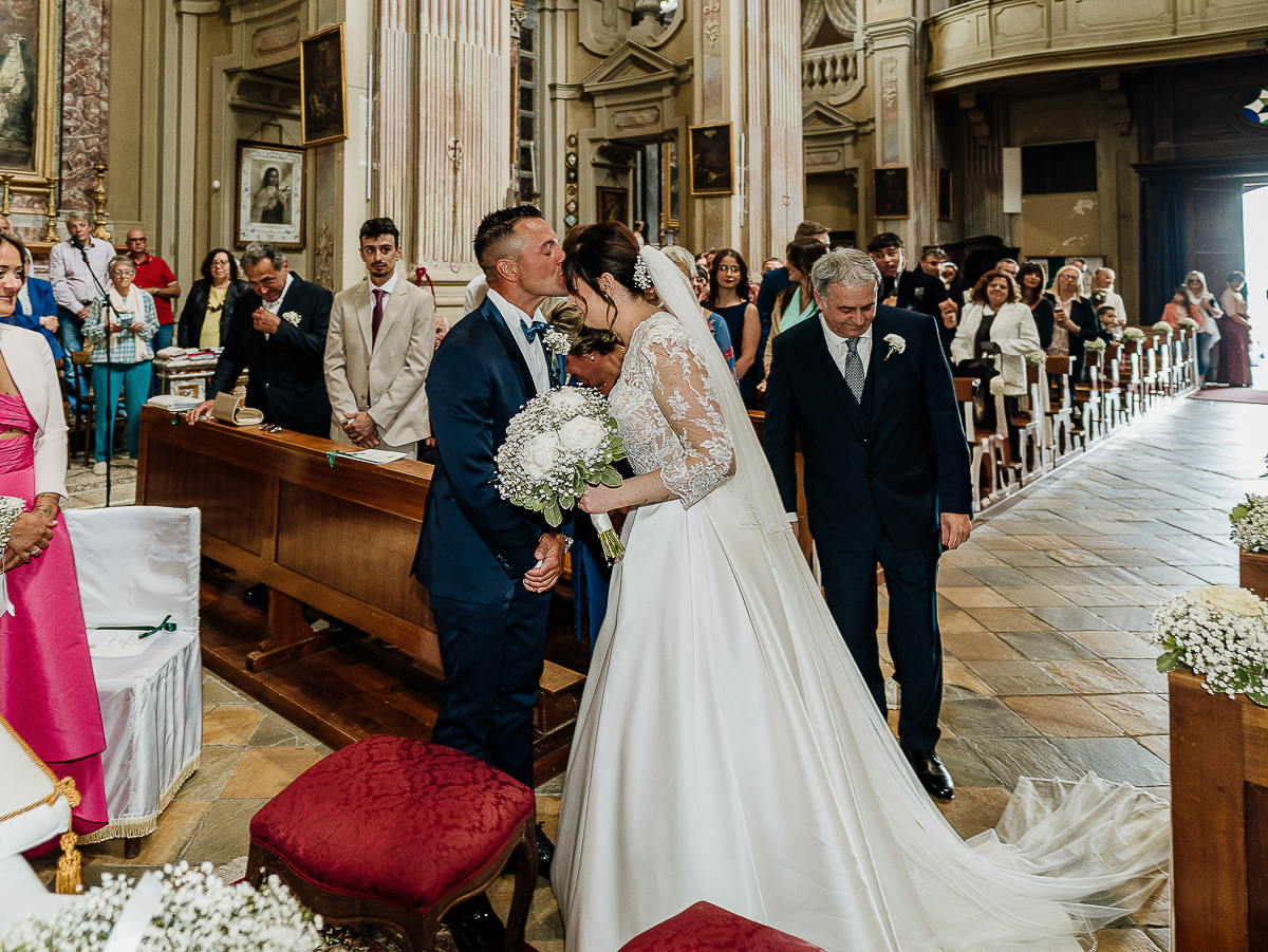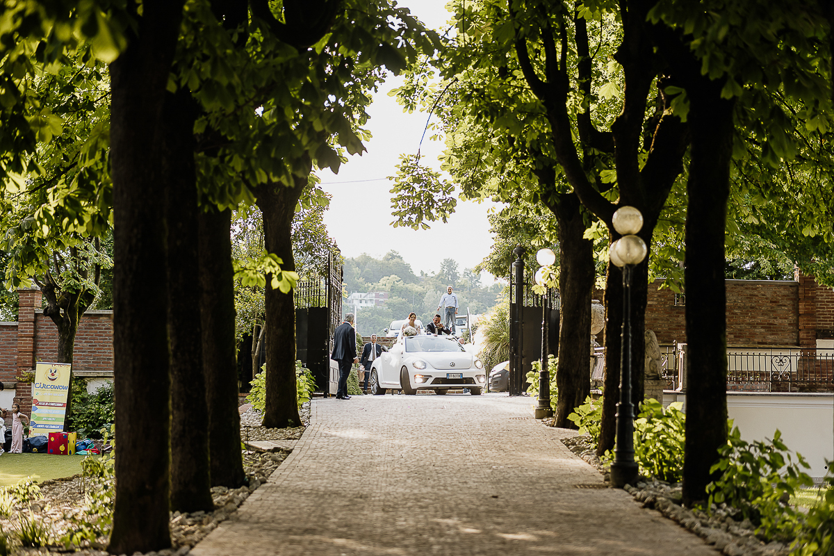 Carolina arrived at the church in a romantic white convertible Beetle, perfectly suited to such a bright day. The ceremony took place at the charming Church of San Giorgio in Andezeno, overlooking the rolling hills of the Chierese area – an intimate, scenic setting, ideal for an elegant wedding in Piedmont.
