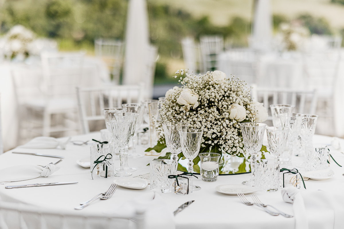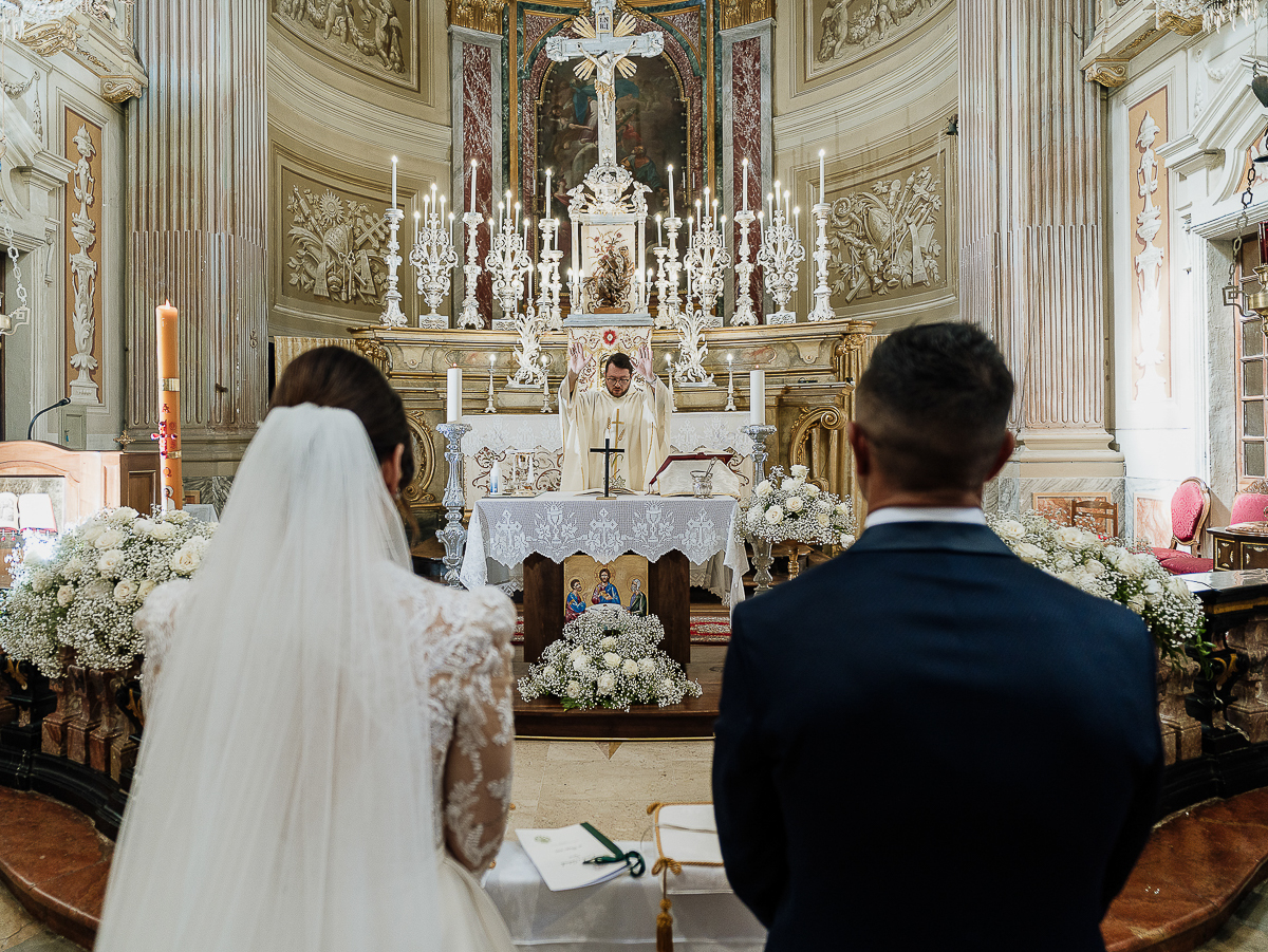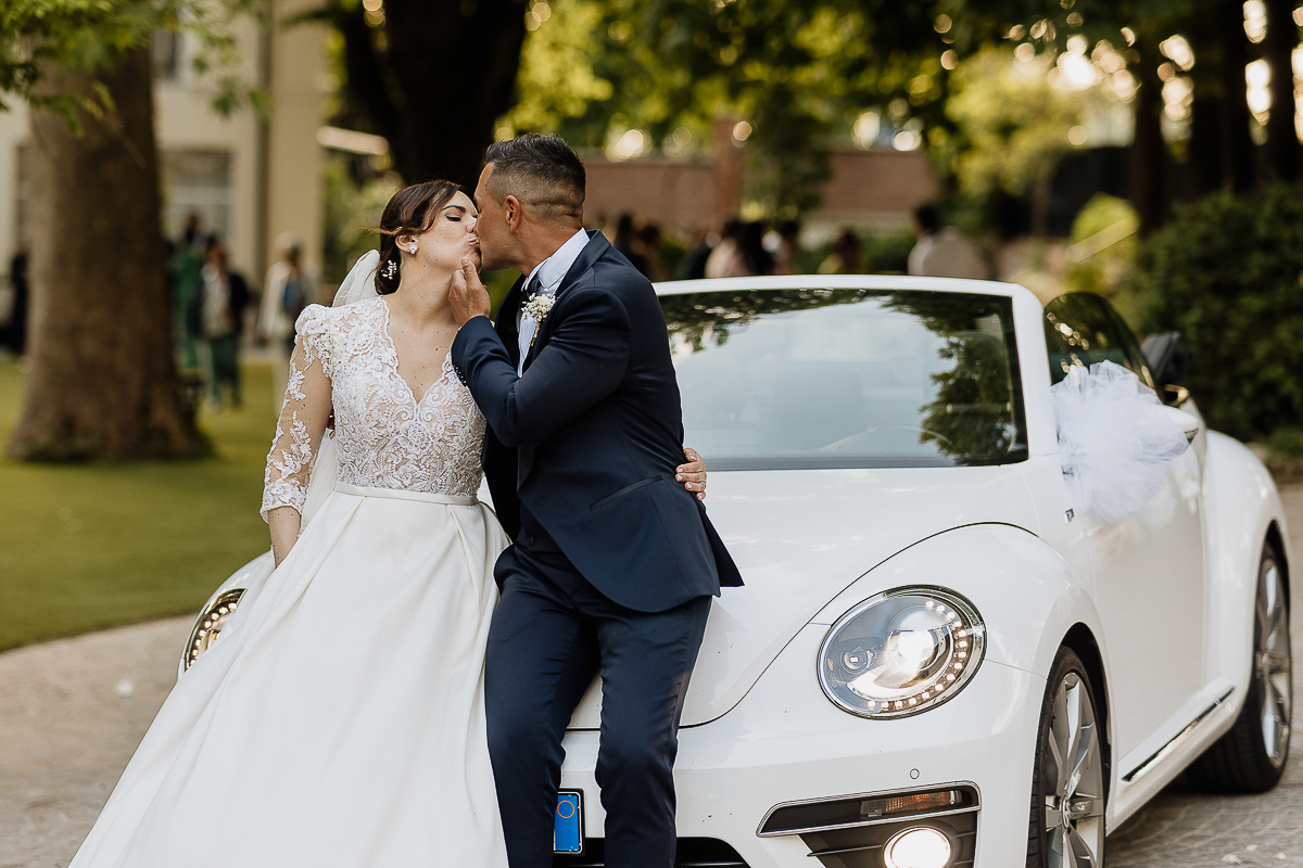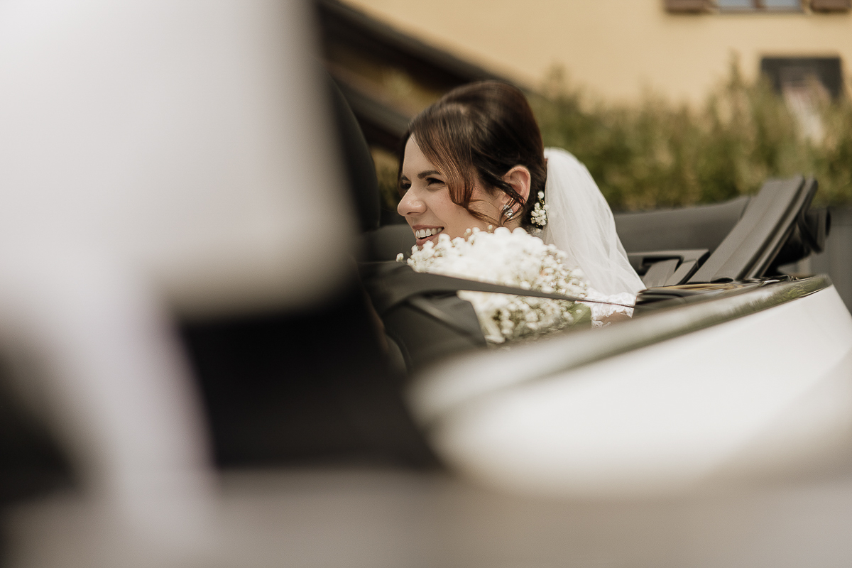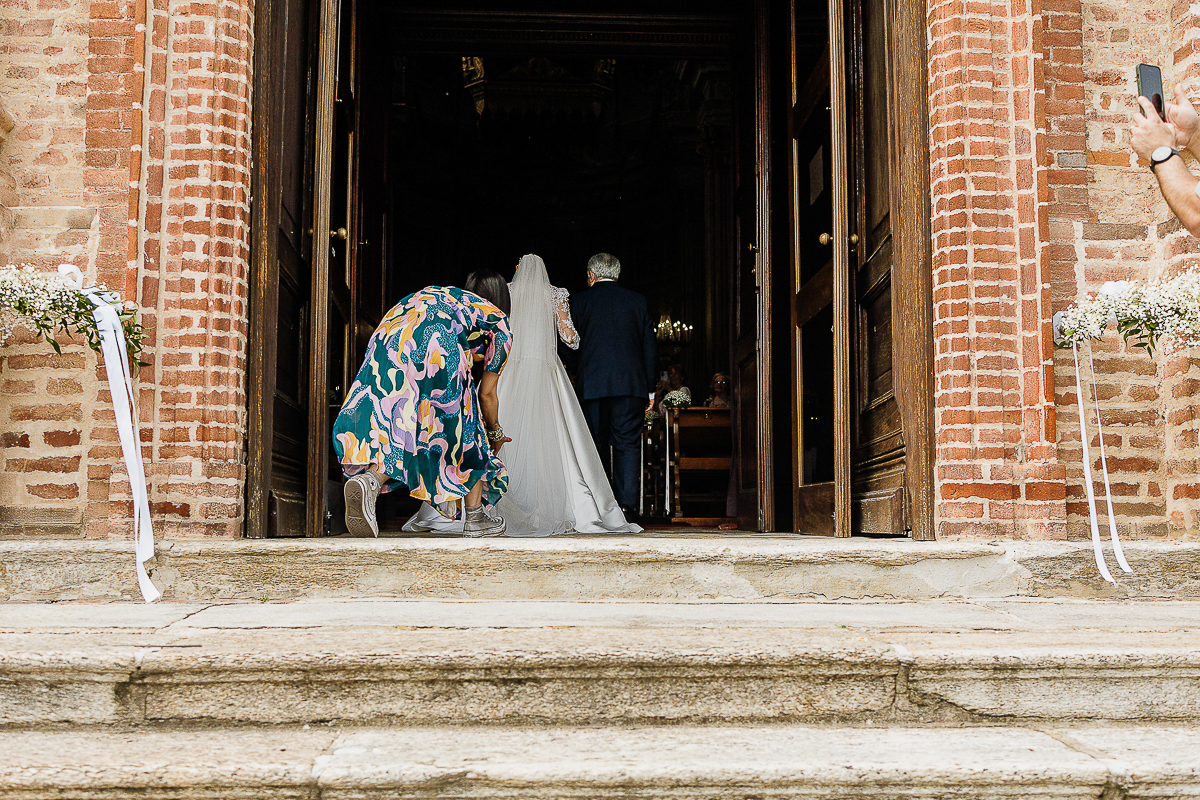 Carolina arrived at the church in a romantic white convertible Beetle, perfectly suited to such a bright day. The ceremony took place at the charming Church of San Giorgio in Andezeno, overlooking the rolling hills of the Chierese area – an intimate, scenic setting, ideal for an elegant wedding in Piedmont.