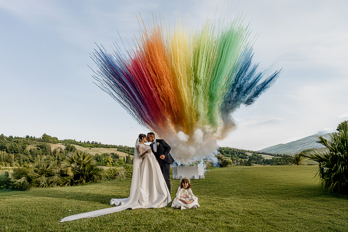 The daytime fireworks were one of the most striking moments of the wedding: an unexpected explosion of color that surprised everyone and resulted in dynamic, cinematic photographs.