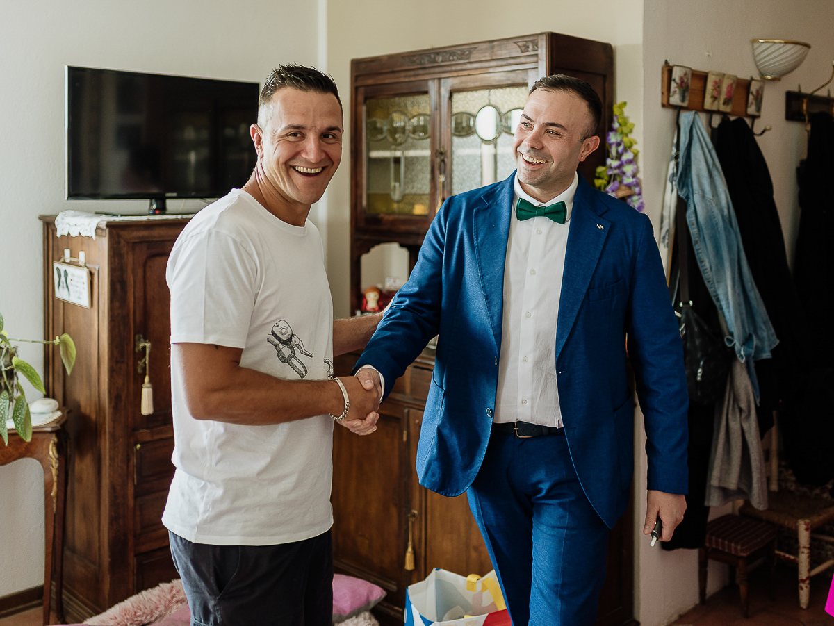 Meanwhile, Gabriele was getting ready in Andezeno, surrounded by moments of calm, family affection, and shared complicity with his best men.