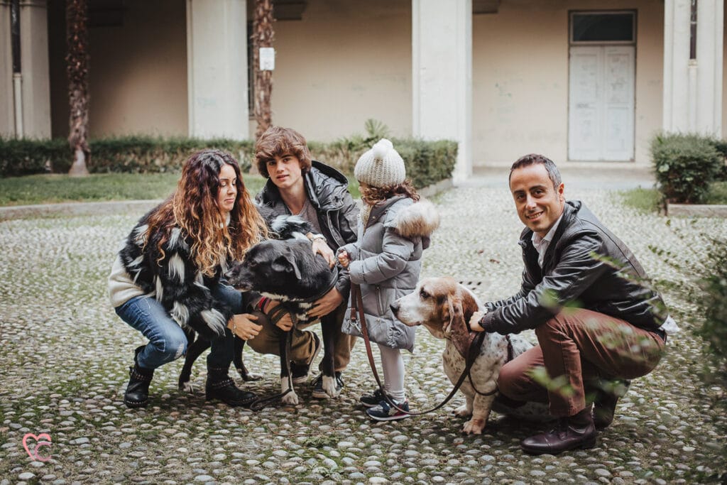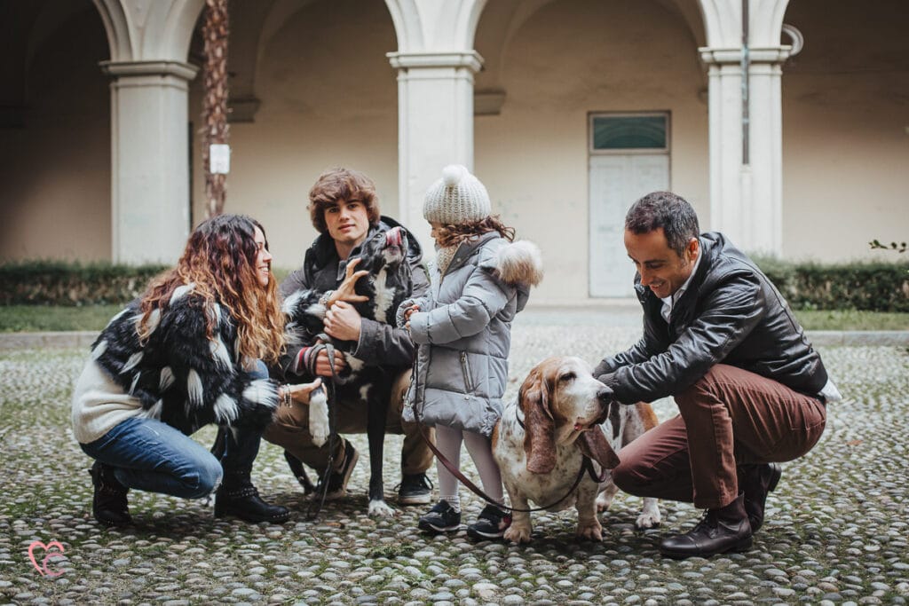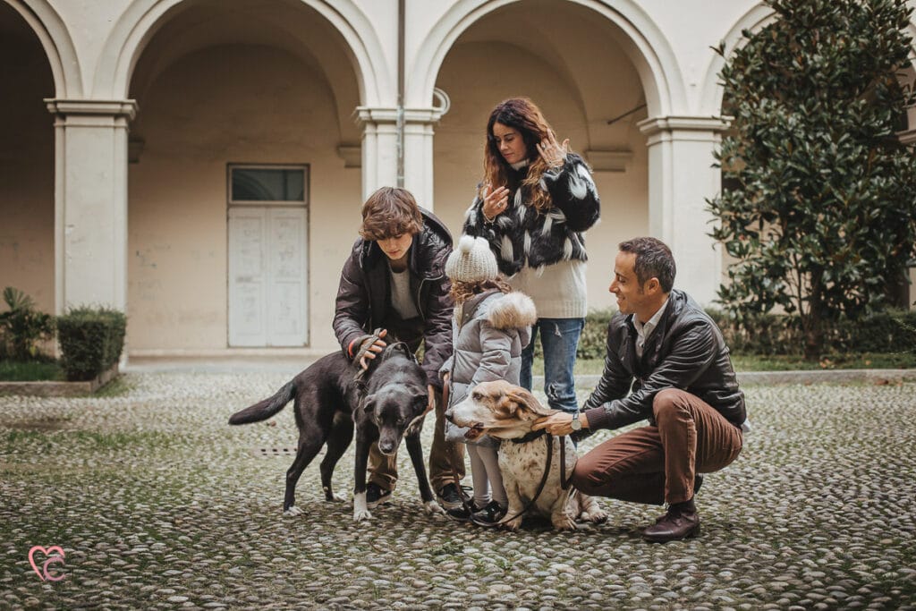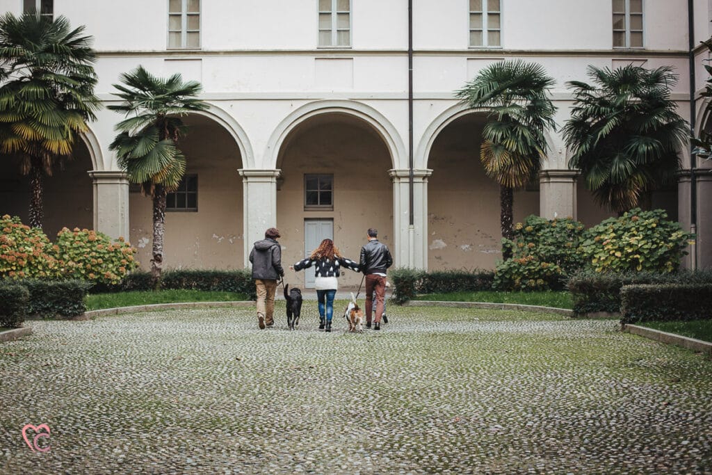 Un altro loro desiderio era quello di inserire negli scatti anche i loro due cani, ma vista la mole abbiamo optato per fotografare tutti e sei in cortile… e che cortile, un antico chiostro di un ex convento!
