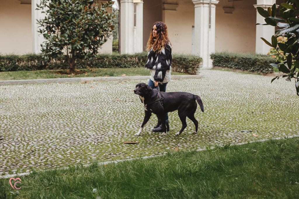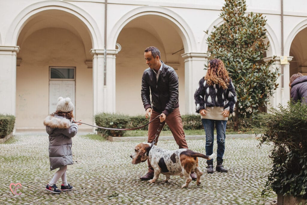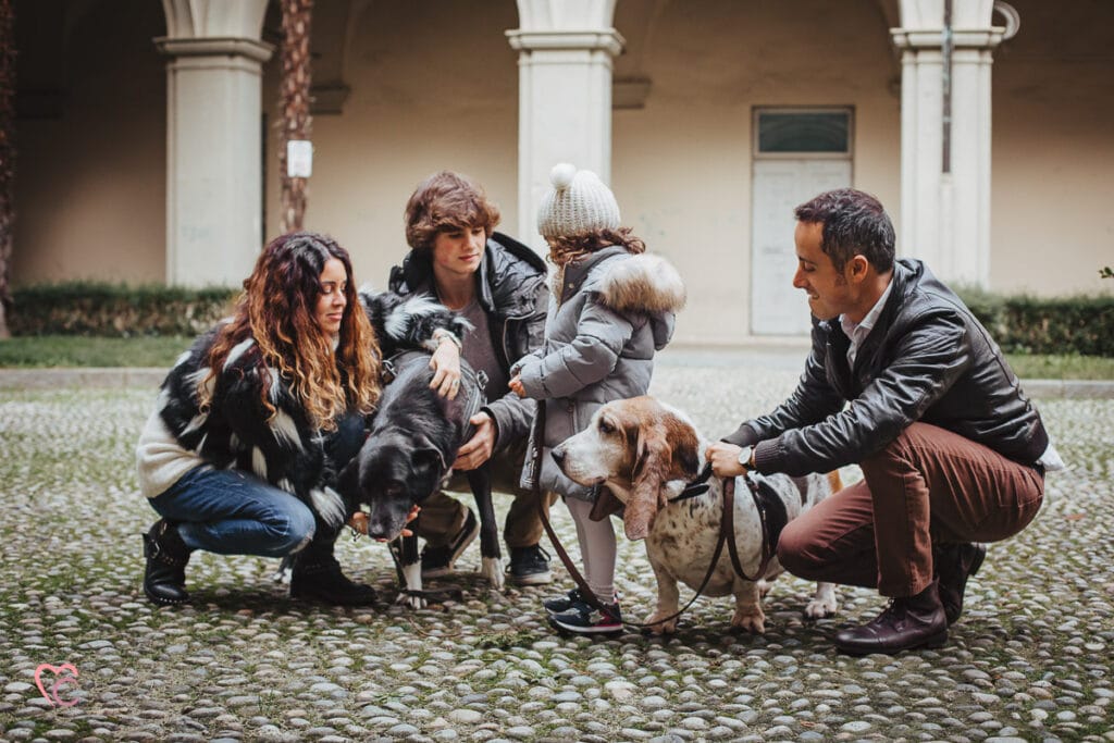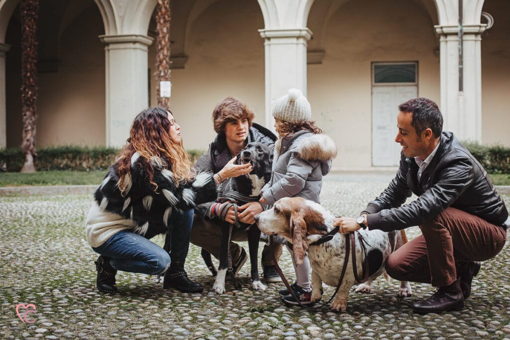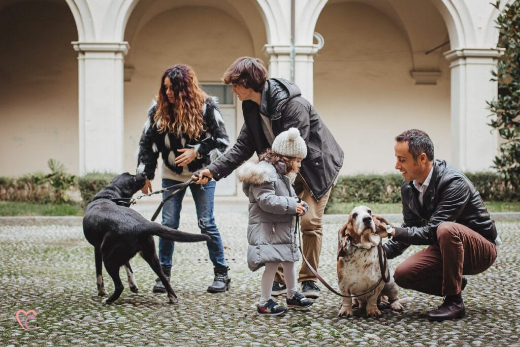 Un altro loro desiderio era quello di inserire negli scatti anche i loro due cani, ma vista la mole abbiamo optato per fotografare tutti e sei in cortile… e che cortile, un antico chiostro di un ex convento!