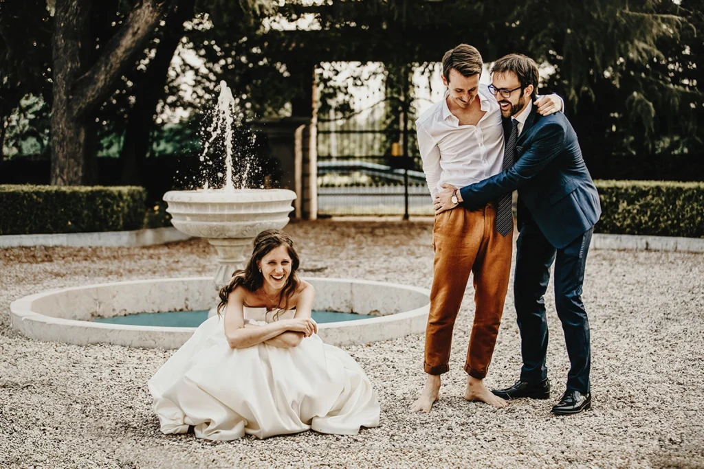 “总有一些时刻没人预料到,却成为最常被讲述的片段。经过数月的准备,Ludovica 和 Riccardo 设计了一段完美的舞蹈编排。但就在最后……一个失手的动作,伴随着摔倒在地的声音。结果呢?所有人都站起来大笑并鼓掌:婚礼的美妙之处就在于,即使是意外,也会成为值得珍藏的回忆。”